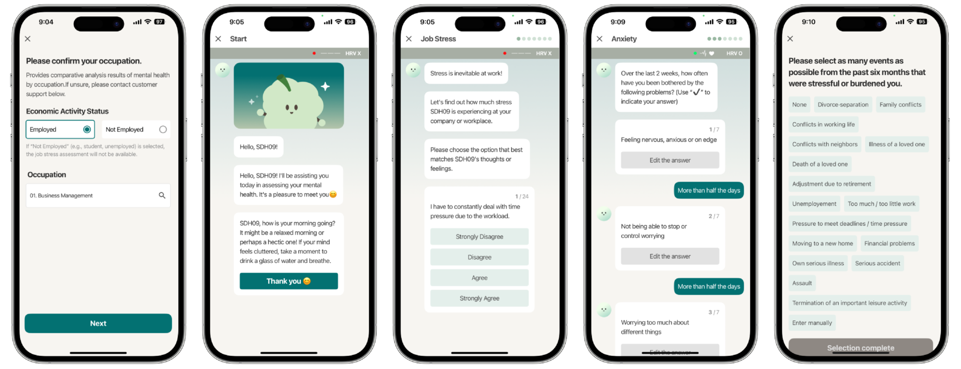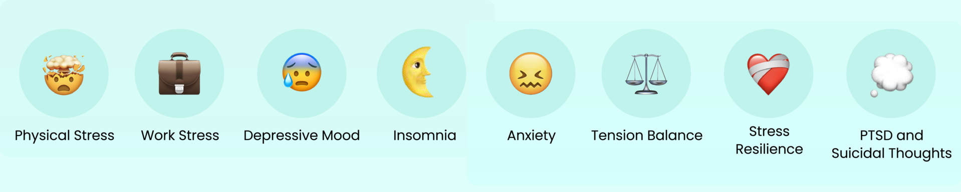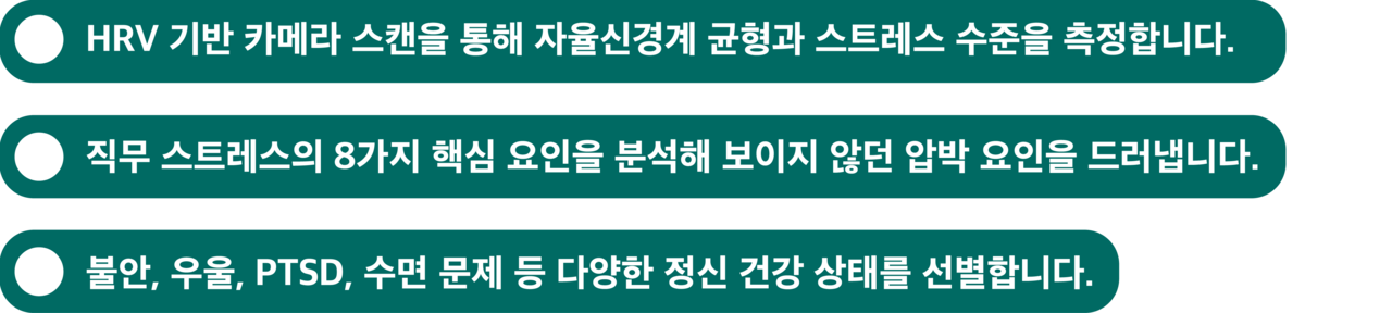 스트레스, 불안, 우울 등 정신 건강 위험 요인을 평가하는 디지털 스크리닝 도구입니다. 총 6가지 검사와 AI 기반 채팅 분석을 통해 개인에게 맞춘 지속적인 관리 인사이트를 제공합니다.