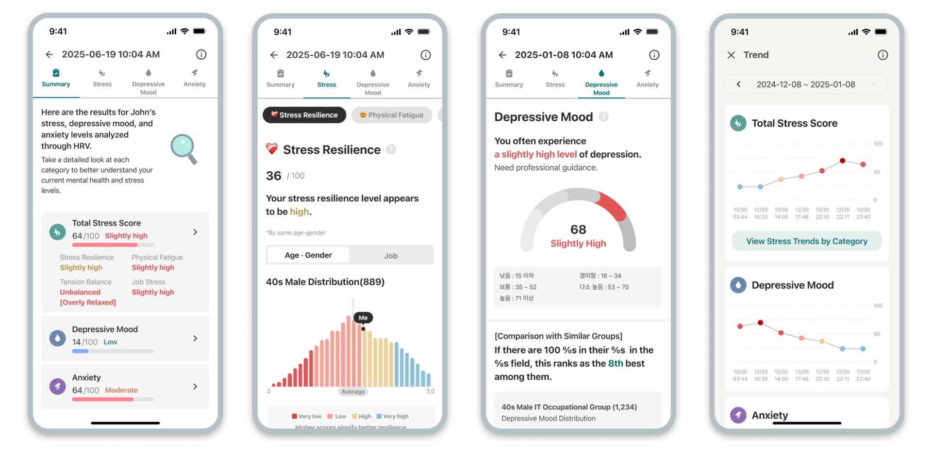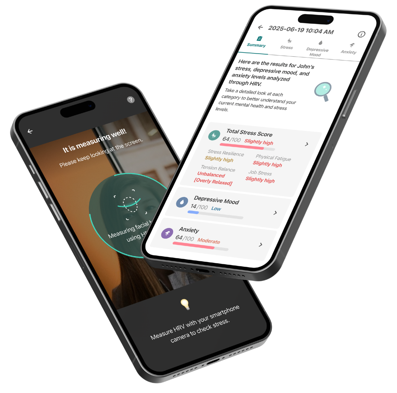 이해하기 쉬운 인사이트로 정신 건강 상태를 확인할 수 있습니다. 각 스캔은 스트레스 회복력, 우울 수준, 불안 지표 등 주요 신호를 분석해 디지털 바이오마커 데이터를 명확한 점수와 변화 추이로 시각화해 제공합니다.