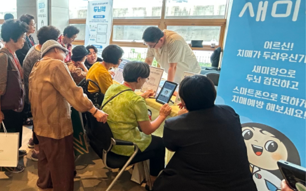‘A Smart Playground for Brain Health’를 주제로 한 부스에서, 시니어 참가자들은 BrainCheck과 Saemirang을 직접 체험하며 5분 테스트와 10분 훈련만으로 인지 건강을 향상시킬 수 있는 방법을 알아보았습니다.